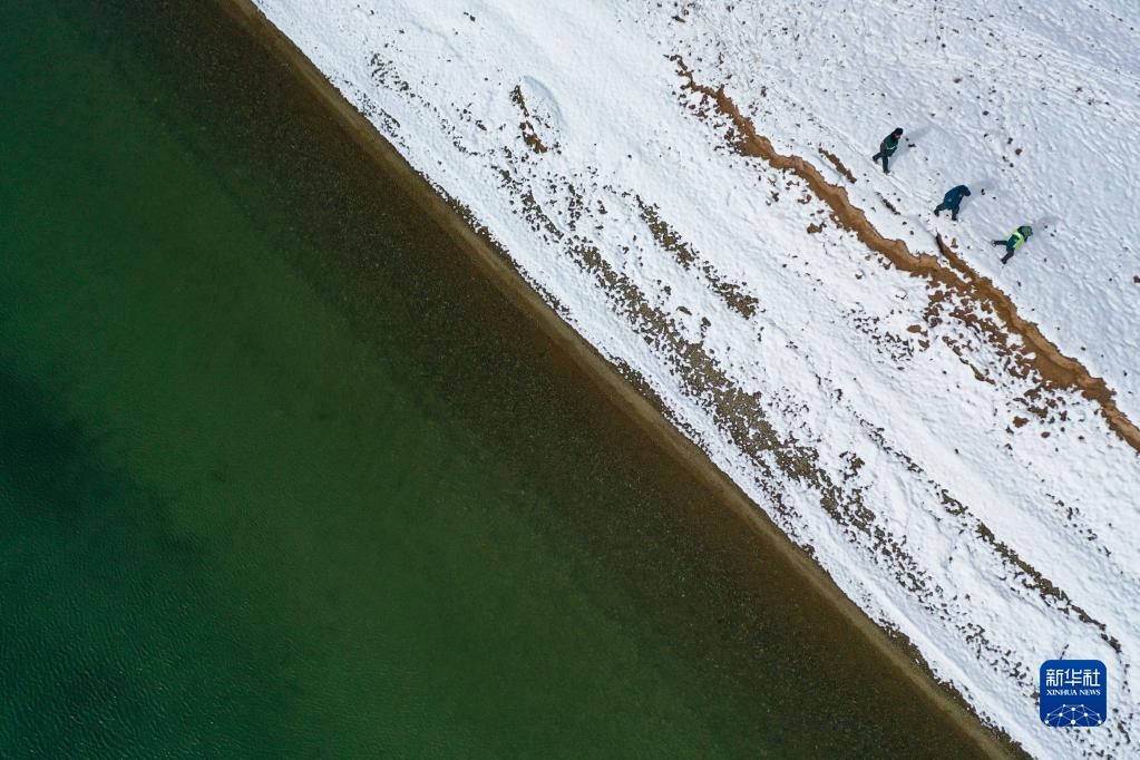 在青海省果洛藏族自治州瑪多縣扎陵湖鄉(xiāng)勒那村,三江源國(guó)家公園黃河源園區(qū)生態(tài)管護(hù)員在巡護(hù)(2021年10月20日攝,無(wú)人機(jī)照片)。 新華社記者 張龍 攝