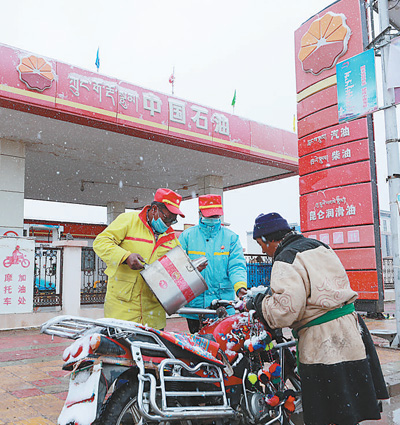 西藏自治區雙湖縣,世界海拔最高的加油站雙湖加油站的摩托車加油處,員工冒雪為牧民的摩托車加油。