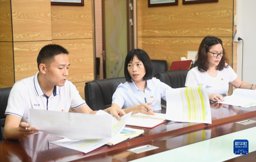 陸秀興(中)與佛山市禪城區張槎街道古灶村“兩委”班子同事開會交流(2022年9月7日攝)。新華社記者 盧漢欣 攝