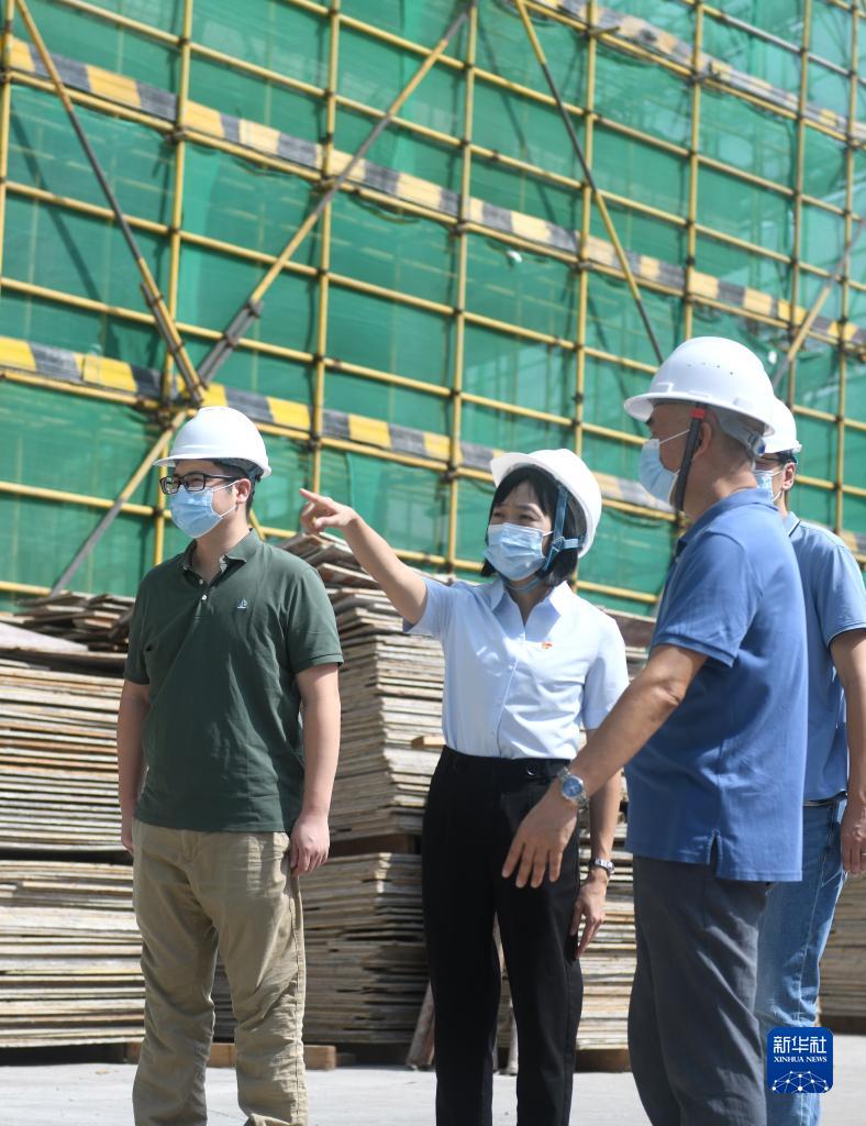 陸秀興(左二)在佛山市禪城區張槎街道古灶村內一處產業園工地上與投資方交流(2022年9月7日攝)。新華社記者 盧漢欣 攝